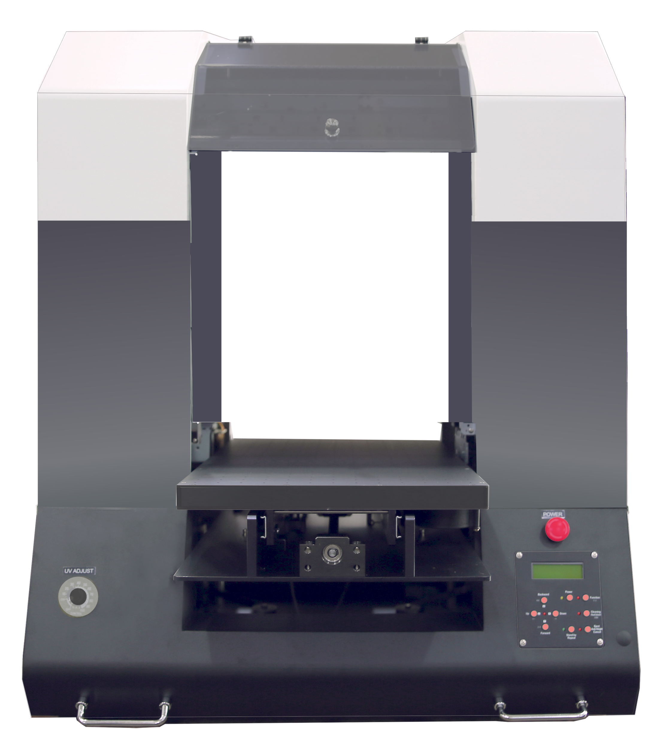 Extrem vielseitig: mit wechselbarem Vakuumtisch sowie optionalem Runddruck- adapter (0306UV VR) bis Ø 100 mm).
