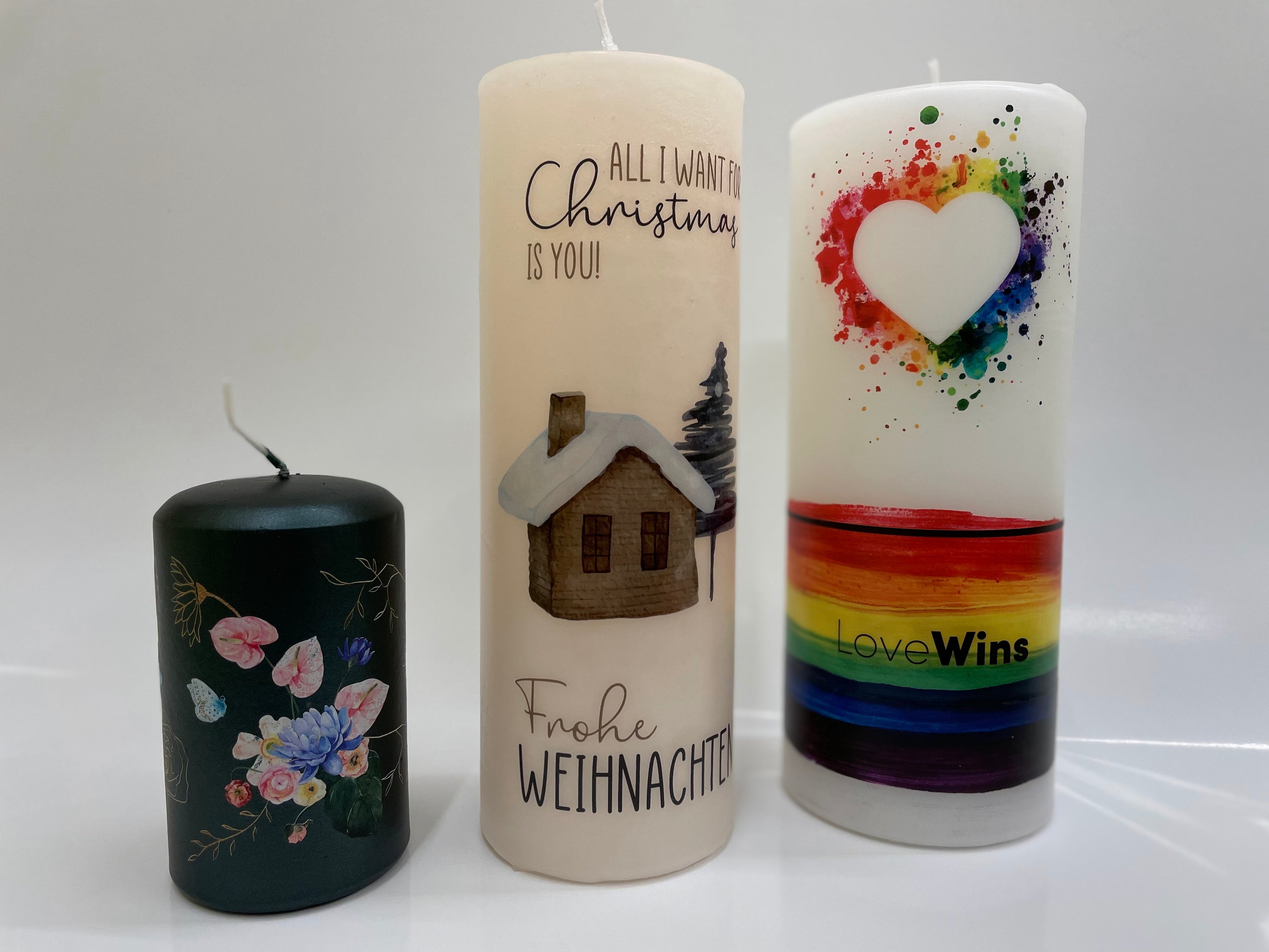 Kerzen mit der Runddruckvorrichtung bedruckt. Diese kann schnell in den kleinen Flachbettdrucker eingesetzt werden.